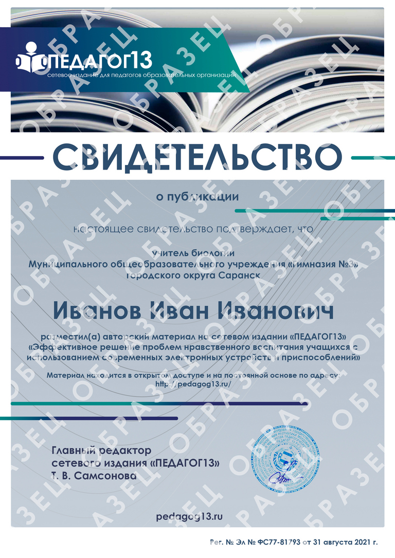 Сетевое издание «Педагог 13» http://pedagog13.ru является официально зарегистрированным в Федеральной службе по надзору в сфере связи, информационных технологий и массовых коммуникаций средством массовой информации. Свидетельство о регистрации ЭЛ № ФС77-81793 от 31.08.2021.
